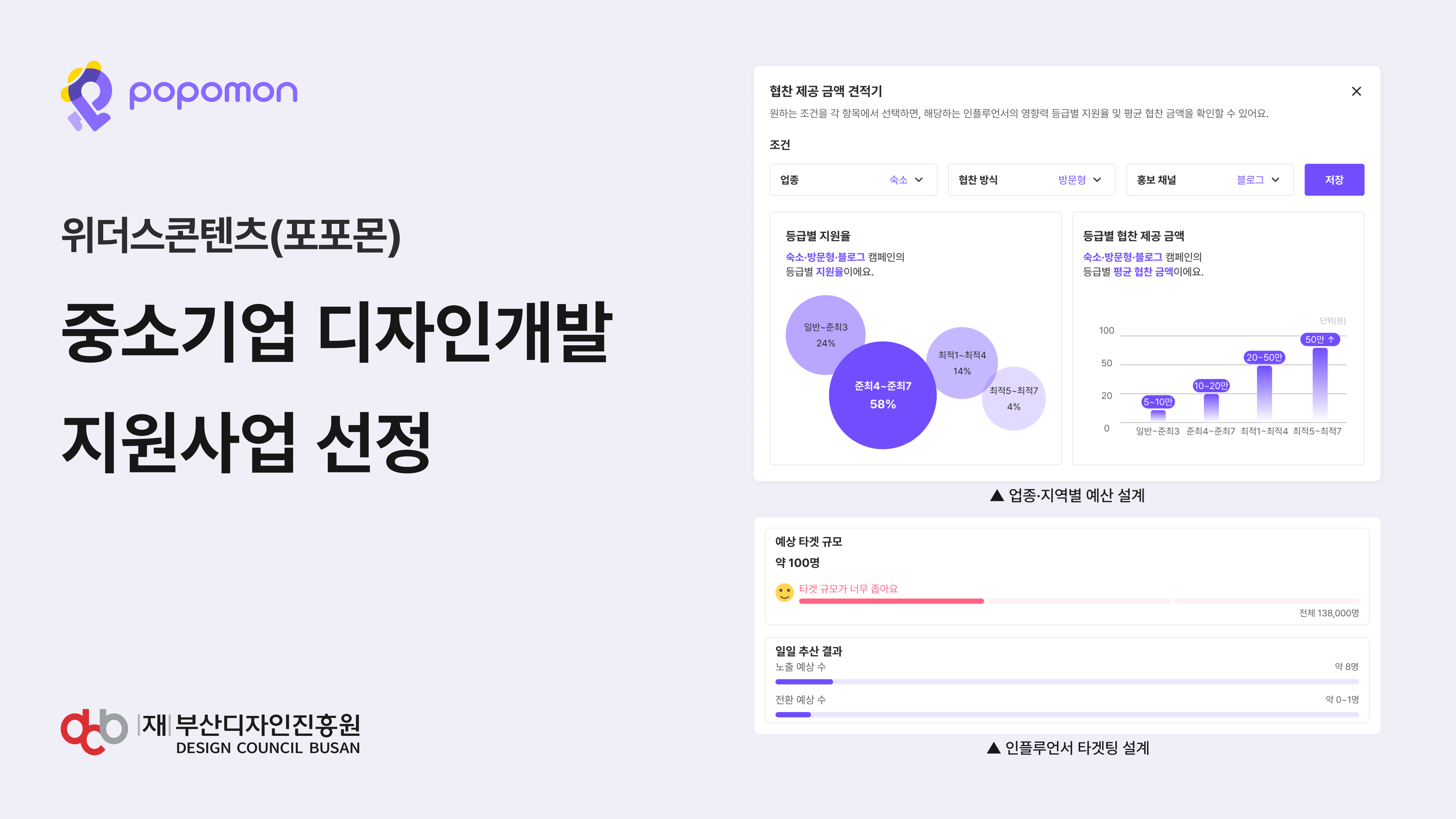 이번 지원사업을 통해 포포몬은 ‘인플루언서 매칭 설계 시뮬레이션 UI’를 개발한다. 주요 기능은 세 가지다. 업종·지역·타겟 설정에 따라 매칭 평균 단가를 제공해 예산 설계를 돕는 ‘업종·지역별 예산 설계’, 채널 유형과 영향력 등의 데이터를 활용해 캠페인 성과를 예측하는 ‘인플루언서 타겟팅 설계’, 적합한 대상에게 캠페인을 노출하는 ‘개인화 추천 시스템’이다.